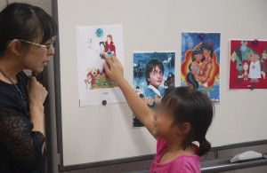 ポスターのキャラクターを指して、「彼女は可愛いです。」「彼は背が高いです。」 と形容詞を使った練習をしました。