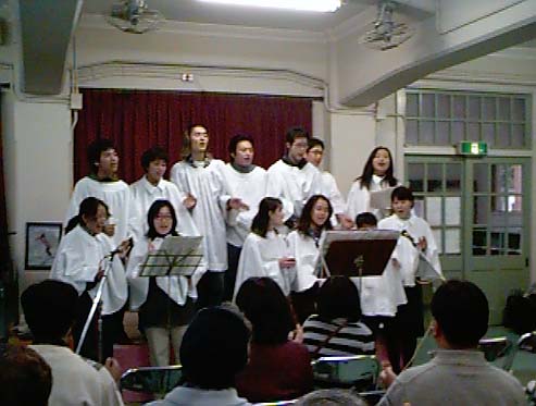 この企画は青年会が昨秋より練り上げたもので、礼拝後にアナウンスを繰り返し、幼稚園父兄にまでご案内を差し上げたりと、宣伝告知し、またミーティングも毎週のように繰り返し、一生懸命準備をしてきました。その甲斐あってか、出演者は幼稚園の子供のピアノ演奏から、プロ級(いや、一部プロも入って)のグループにいたるまで十六組がそれぞれの技を披露しました。トリは青年会の「なんちゃってゴスペルシンガーズ」。何度も練習を繰り返しただけあって、ゴスペルの片鱗が見えました。会場も満席で、本当に素晴らしい企画となりました。青年会―乗りに乗っています!