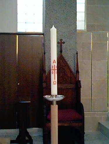 このろうそくは大斉節の聖土曜日の礼拝の中で祝福され、復活日から聖霊降臨日(今年は6月11日)の前日まで毎礼拝時に灯すものです。また、誕生、逝去、逝去記念、洗礼、堅信など、人の生命に関わる礼拝時にも年間を通して点灯する習わしのものです。有効に利用していきたいと思っています。