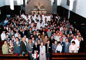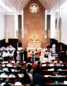 4月23日(日)は新しい聖堂で初めて迎える復活日。約140名が出席して御復活の主に大いなる感謝と賛美をお献げしました。大礼拝ではこの日のために大斎節中熱心に練習を重ねてきた聖歌隊が、チャンセル左側に座を占めてご奉仕しました。たまたまお隣の旅館に滞在しておられたアメリカ聖公会退職司祭エドワーズ師(写真前列右から二人目)がチャリス奉仕をしてくださったので(ニュースの頁参照)分餐が予想外に早く進み、聖歌隊がもっとも力を入れて準備していた一曲を歌いそびれてしまうほどでした。しかし、音響を十分に考慮して設計された聖堂の響きがよく生かされたすばらしい歌声で、エドワーズ司祭もしきりに感嘆しておられました。浦地司祭が転勤に際してお献げくださった復活のろーそくも、ひときわ光り輝いて御復活の喜びを告げていました。礼拝後は会館ホールで持ち寄りのごちそうをいただきながら楽しいひとときを過ごしました。早朝の英語聖餐式にも旅行中の外国人が大勢見え、世界に広がる教会を実感しました。