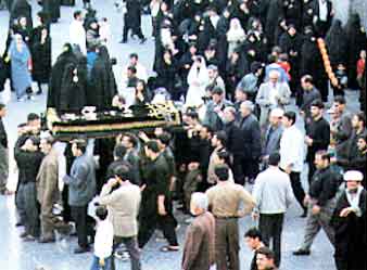 (写真はムスリムの葬儀。遺体をモスクに運び、葬儀礼拝の後に土葬する。埋葬は右脇腹を下に、顔をメッカに向けて横たえるので、墓はすべて同じ方角に向く。火葬は地獄の業火に等しいとしていかなる場合も禁じられる。葬儀全体は急いで執り行われる。)
