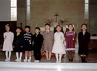 2001年度の卒園式を3月19日に行いました。8名の子ども達が巣立ち、5校の小学校に分かれて進学いたします。どの子もマリアの代表のような形での進学です。羊(神様)を忘れず、各々の学校での環境に素早く順応して、お友達を大切に、どんどん自分の世界を広げていってほしいと願っています。新しいお友達をすっと受け入れられる子ども達です。みんな心優しく育ってくれました。これからも神様にいただいた力を発揮して、どんどん伸びていってくれる事を期待しています。小さな輪は保護者が入って大きくなり、その輪の中に新しい方との出会いをも加え、マリアの輪が大きくなるように祈ります。