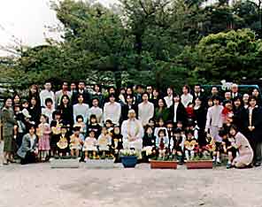 2002年4月9日始園式、10日入園式で、聖マリア幼稚園の新しい年度が始まりました。4月22日現在、花組18名(うち小花1名)、赤組13名、緑組10名の全員で41名になりました。花組は浅間麻衣先生、赤組は藤田尚子先生、緑組は生谷朋子先生です。ベテランの先生達が揃い、各々の子供達への関わりが広がり、深まり、先生たちは子供達を愛し、可愛がり、新学期の忙しい中、疲れを感じながらも新しい毎日を送っています。子供達がお帰りした後、職員室ではその日の子供達の様子が飛び交っています。花組はやっと11時半のお帰りに揃いました。(昨年度から花組の子供達は1時半の午後保育です)お母さんから離れて一人で通い出した子供達、早い人は8時半から10時半まで、更に延長になって、11時、そして、今、11時半になりましたが、お母さんと離れる不安を募らせながら、幼稚園でのお友達やいろんなルールのある中での関わりで、緊張が続きます。でも、幼稚園で学ぶ事が楽しいと感じられるようにもなりつつあり、お椅子に座る事も出来るようになってきました。そして、初めての製作「こいのぼり」も上手に仕上げられました。赤組はというと、新しいお友達二人をしっかり仲間に入れ、遊びが始まっています。でも、花組が泣いている時は、助けてあげたい気持ちと共に、今まで小さい組で、皆から助けてもらっていた子供達なのに、四月になってその小さな皮を脱皮し(させられ?)て呆然としている姿が見受けられました。でも、もうお庭でもお部屋でも落ち着きを見せ始めています。そして、大きくなった緑組、先日の「平安神宮」へのお散歩はしっかり花組の手を繋ぐ責任が課せられました。意気込みも充分、そして花組さんも上手に歩いたお陰で、気持ちの良いお散歩になりました。26日の植物園への「春の遠足」が楽しみです。