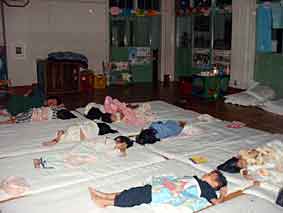 毎年恒例の年長組のお泊まり保育を行いました。一学期も終わり頃には「先生!幼稚園でお泊まりするんやなあ!ごはんはカレーライスやろ!」「そうや、おばけもでるんやんなあ!」と興味津々、ちょっぴり不安の子ども達でした。お家を離れて初めてのお泊まり。お友達、先生が一緒とはいえ、お泊まりのために何度も荷物の整理をしたり、プログラムを確認したりと、お家の人達の手を借りずに自分たちの力ですることがいっぱいありました。とはいえ、子ども達にとってはプログラムのひとつひとつが楽しみな事ばかり、ホールに広がったお布団の上を転げまわるのも、皆で一緒のお風呂屋さんも、キャンプファイヤーや食事の準備も、みんなのために力を合わせて準備する事も、新鮮な喜びにつながりました。めっちゃくちゃこわかった肝試しもなんとか10名全員がクリアし、無事宿泊保育を終えました。