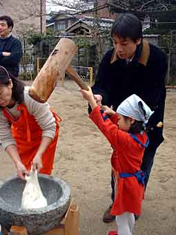 2003年は羊年!正に聖マリア幼稚園の一年!と、気持ちも新たに清々しい一年の幕開けを迎えました。その一年の初めの行事といえば、恒例の『お餅つき』です。当日の早朝はあいにくの雨模様・・・園庭での、『お餅つき』の決行に少々不安を抱えつつも、「必ず!晴れる!」と、信じて・・・子ども達は、予定よりも一時間遅れの登園となりました。それまでに、まずは園庭の水たまりを地均しし・・・すると、みんなの思いが届いたのか、雲の間から、お日様の光が・・・。というわけで、子ども達が心から楽しみにしていた『お餅つき』が無事にスタートしました。中には、お餅を搗く事が始めて・驚く事にお餅を食べるのが初めて、という子どもも(いずれも年少児ですが)、とにかく、お家の方々と一緒とあり、みんな興奮状態!しかし、やはり、マリアっ子の一日の始まりは、心静かに『お礼拝』からです。朝のご挨拶をし、聖歌を歌