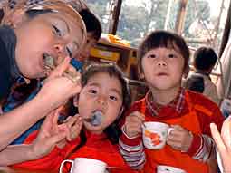 い、残念ながらお休みしているお友達の事もお祈りしたり、「主の祈り」をみんなで唱え・・・。さあ!いよいよ!エプロンを着けて!搗いて!丸めて!つまみ食い!?そして、最後は、お母さん達の愛情たっぷりの様々な『お餅』・・・何と頂くお餅の種類は、きなこ・あんもち・よもぎあんもち・いそべ・ゆかり・かぼちゃ・大根おろし、そして、おすましと実に八種類のボリュームたっぷり!!子ども達の可愛いお口からは??「おいしい〜〜!!。」そして、笑顔が溢れ、今年も大満足の『お餅つき』となりました。もち米35s・25臼のお餅は、当日だけでなく後日、伸し餅(種類は、海老・七味・胡麻・ピーナッツ・青のりです。)として持ち帰る分にも変身・・・。