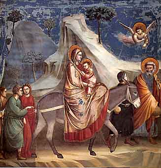 下に掲げたのはジオットの絵です。右端のヨセフを先導役として、中央に毅然とした姿で描かれたマリアと幼な子は、逃れ行く者というより勝利者の凱旋のようで、ロバに乗ったその姿は主イエスのエルサレム入城を連想させます。マタイはこの出来事を預言者ホセアの預言「まだ幼かったイスラエルをわたしは愛した。エジプトから彼を呼び出し、わが子とした」(ホセア11・1)が実現するためであったと述べています。速水敏彦先生はこれを、イエス様の十字架の死が「新しい出エジプト」の開始であると考えた初代教会の信仰を受け継ぎ、そのことがイエス様の誕生においてすでに予表されていることをマタイは示したかったのだ、と指摘しておられます(『イエスの教え―マタイのアングル』296頁)。おそらくジオットも同じような理解をもってこれを描いたのではないかと想像します。