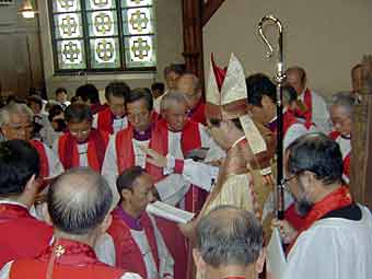 全国からの主教様18名をふくむ56名の大プロセッションで入堂、パイプオルガンに加え、管楽器の奏楽、厳選されそのための練習を重ねた聖歌隊の奉仕、手話の同時通訳等、洗練された聖餐式になりました。式の出席者はなんと600名以上。とうてい主教座聖堂には入りきれず、平安女学院室町校舎に第二式場を設けてビデオの同時中継をし、4名のパテン、8名のチャリスの分餐により聖餐にあずかりました。