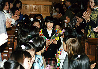 川端通りの桜の蕾も膨らみ、若い柳に、ゆきやなぎ、れんぎょ・・と毎年のことながら淡い「春」の色合いが出揃い始めました。教会の方々にはこの一年間、聖マリア幼稚園の園児、保護者、教職員の為にお祈りをして頂きましてありがとうございました。まだ残務処理があるとは言いますもののお陰様で、無事2003年度を終える事が出来ました。この場を借りて、先ずは卒園式の一コマから。卒園式は18日の午前中に行ないました。運悪くその日の午前中のみが雨模様で、着物姿のお母様方は気が気では無かったと思います。一三名の卒園生が小さな初めての巣を飛立ちました。小さいけれど、初めてだから一番勇気が要るかもしれません。今迄とは全く異なった「学校」という「木」に止りに行かねばなりませんから。13名は各々錦林校5名・御所南3名・四錦・北白川・ノートルダム2名・京教大附属の六本の木に飛んで行きます。それが、ぶどうの木でなくても各々の枝々に連なり、多くの友達と出会い、善き師に恵まれる事を望んで止みません。神様から頂いた様々な各人の能力が生かされるように、そして、隣の人にそれが生かされる様にと。それは、例年のようにお礼拝堂での卒園式でした。13名のうち、当園の卒園式を経験して下さっている保護者は何とただおひとりのみ。あとの12名のうちこれから、回を重ねて経験して下さる方々もおいでになりますが、初めてで終わりであろう方々は半数以上もおいでになりました。しかし、みんな、この幼稚園が良いと思って共に通って下さいました。子どもたちは修了証書の他に皆勤賞や精勤賞の賞状を頂きます。年長組の中に三人の皆勤賞の子ども達がいました。それが何と一人は三年間の皆勤、一人は二年間と一年間の精勤、あと一人は二年間の皆勤と、三人共が、単年の皆勤ではなかったのです。素晴らしい願張りの心と強い身体を神様から頂き、保護者の協力をもって通園して下さったのでした。また、他には難しい聖歌や、送辞、答辞をはじめ 在園生からのお祝の言葉など、次第が進められていきました。先生達が丹精込めて作ったアルバムをはじめ、記念の品々を頂く場面もありましたが、その中に母の会から全員に頂くお祝紅白饅頭があります。代表のお当番が頂きに行くのですが、卒園式が初めての花組は「自分にはお饅頭がもらえない!」とドキドキしていたようです。可愛いものですね。でも、良かった頂けて。卒園生は最後に「主イエスとともに」の歌で送り出してもらい、園庭では、待ち構えていた在園生の親子トンネルを潜ってお開きとなりました。次は、一九日の修了式のひとこまを。最終日はいつものように、花組と赤組はホールで下田屋チャプレン先生にお礼拝をして頂いてから少しゲームをして、お土産のアルバムを頂いて帰る事になっていましたが・・・。まあ、何て嬉しいのでしょう。教会のいえ、幼稚園の評議員をして下さっている、旧教員のみどり先生のお父様である立石先生が突然ご参加下さったのです。先生がチャプレン先生と一緒に来られる前に、立石先生の情報を子ども達に話しておきました。お医者様だと言う事も。そして、礼拝のあと、卒園式の事をお聞かせしたり、皆(精)勤賞の子ども達を紹介したり・・また今、胃腸風邪で休んでいるお友だちがいる事等を話した後、「元気に幼稚園に通う為にはどんな事に気をつけたら良いのでしょうか」という質問にお答え下さいました。ひとつ目「好き嫌いせず、何でも食べる事」ふたつ目「うがいをして、きれいに手を洗う事」と話して下さったのです。子どもたちの真剣な眼差し。いつも聴いているお話なのに、お医者様からの、そして、今、病気で無い自分が此処に居る事で食い入るように聴いていたのでした。そのあと、下田屋先生に「今日は4月からの練習の為に大きい椅子に座っているのですよ。ひとつ大きくなる為には、どんな事に気を付けたら良いでしょうか?」と尋ねると「みんなと仲良くすることだね。」「お口にチャックする事も仲良しになれる大切な事なんだよ。」と優しくお話ししてく下さったのです。子供達はまたしても自己主張をしては相手に言い過ぎて、喧嘩をしてしまう事が良くあります。しかし、これは、子どものみでなく、大人にとっても、相手に言い過ぎない、相手を傷付けない為には大切にしなければならない事なのでは無いかと思いました。その後、各先生から各々のクラスに進級する為のお約束を聴きました。そして、やっと、ゲーム!! 先ずはスキップつかまえから・・・。お客さま先生もチャプレン先生も共にゲームを楽しんで頂き、あっと言う間に11時15分になりました。今年度は教区での「子どもといっしょ」キャンペーンの年です。教会に連なるこの私達の幼稚園へも教会の方々をお招きして共に時間を過ごして頂けたならなあと思いました。もし、ご招待させて頂いたその折にはご協力の程、宜しくお願い致します。こんな風にし