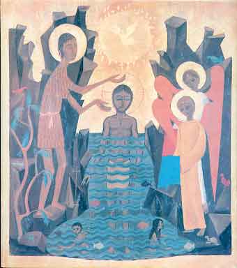 これは、イエス様が洗礼を受けておられる場面を描いたイコンです。テゼ共同体で購入しました。多分、テゼのブラザーが描いたものと思われます。イコンは、一枚の絵でありながら、その中に様々な意味が込められています。専門的に学べば詳しく解読できるのでしょうが、私にはよく分かりません。しかし、ある程度の時間、このイコンの前で黙想してきた者として、いくつかのことが言えようかと思います。真ん中にイエス様、左手には洗礼者ヨハネがいます。イエス様が浸かっているのはヨルダン川、イエス様の足下には、小さく男女の姿があります。これはきっとアダムとエバでしょう。イエス様が「新しいアダム」として、人類に罪の赦しを与える方だと言うことを表現しているのでしょう。イエス様の右手の指先をよく見ると、かすかに十字架が描かれています。これから始まるイエス様の宣教の生涯が、十字架へとつながるものであることを示しています。川の両岸は険しい岩場です。洗礼の直後の「荒れ野の誘惑」を思わせます。そして、ヨハネの対岸には、天使が二人、タオルらしき物を持って立っています。一方の鮮やかな青色は、聖母マリアがよく来ている上着を思い起こさせます。そのときには「純潔」を意味します。もう一方の赤色は、「苦難」を意味します。このように、イエス様の洗礼の場面は、宣教の生涯の最初でありながら、すでに十字架をはっきりと示していることが分かります。そして、最も大切なのは、イエス様の頭上に降っている輝く鳩です。これは、聖霊を表現しています。そして聖霊は、神さまの重要なメッセージを運んで来ているのです。「あなたは私の愛する子、わたしの心に適う者」と。