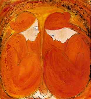 今月も先月に引き続き、ナリニ・ジャヤスリヤ著『サッテヤ…言葉と絵による黙想』(日本基督教団出版局)の中から引用しました。「語らい」という題名が付いています。先月とほぼ同じ構図をしています。大きく違うのはその色彩です。先月の「受胎告知」は、さわやかな水色の地に、無数の白い線がまるで渦巻きのように二人の周りを取り囲んでいました。今月は、燃えるような赤もしくは朱色で、線は描かれず、絵の具の筆遣いとぼかすように描かれた黒い影で二人が円形に、「まんまる」になっているのが分かります。詩で分かるように、この二人はキリストの母マリアとエリサベトです。唇の様子から、右側の人物が語り、左側の人物が聞いているのが分かります。私たちは人の話を聞くときには相手の目を見つめ、自分の思いを語るときには視点があちらこちらと動くものです。二人が向かい合い、語らいながら、お互いをいたわり合い、力を与え合っているように感じます。二人はまだ内側を向いていますが、すぐにも外へ飛び出すエネルギーが蓄えられています。それが鮮やかな炎の色彩で現されているように思います。
