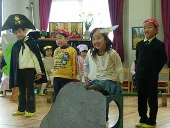 さて、幼稚園では2月23日(土)に、「春の集い」が行われました。一年間の締めくくり、集大成の大きな行事です。約一ヶ月、この日のために、練習を重ねてきました。子ども達と相談しながら何の劇をしようか、それを通して子ども達に何を伝えていこうか、楽しく、また数々の台詞を通して言葉の習得も出来るように・・・と先生達は各々のクラスの、いえ、各々の子ども達に合わせるべく言葉選びをして行きます。「感謝祭」にも歌や劇等のご披露をします。が今回は、朝の挨拶・礼拝後に進める司会の大役を年長の緑組が担いました。どのような内容だったのかをちょっとご紹介しましょう。