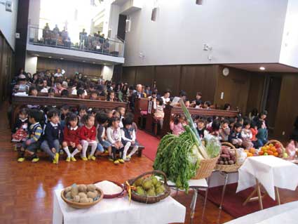 また、感謝礼拝の中では幼児祝福のお祈りを子ども達にして頂き、各ご家庭からお持ち頂いた収穫の恵みに感謝の祈りをお捧げ致しました。文字通り、感謝の「祭り」の一日となりました。何より、子ども達がお招きしたお客様の前で恥ずかしそうに、でも嬉しそうに歌い、演奏する姿に、目を細めて見守られていたご家族が大変印象的でした。子ども達の一挙手一投足に笑顔がこぼれ、一生懸命、真剣に頑張る姿には、心を同じにして見守って下さいました。そして、大きな拍手を幾度も送って頂き、子ども達もご満悦の表情を見せていました。さらに、翌週には勤労感謝の慰問で川端署とくろたに交番へお出かけしました。更に更に、感謝礼拝でお捧げした食材は豚汁とサラダとヨーグルトフルーツにみんなで調理し、お腹いっぱいポンポコリンになる恵みに与りました。さて、季節はまた先へと進み、クリスマスを迎えるアドヴェントの頃となりました。「ありがとう」の心を思い、今度は周りの人への思いやりに、そして、大切に出来る「愛」の心に繋がるように、子ども達と先生達とそして、ご家族と地域の方々、教会のみな様と育んで行きたいと思います。クリスマスソングにのせて、イエス様のお誕生を待ち望みながら・・・。