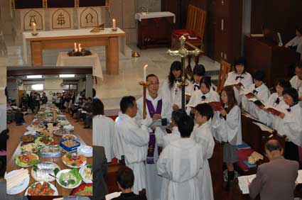 クリスマスイブに行われるキャンドルサービスは「九つの日課による唱詠晩祷」。聖書朗読・黙想講話と黙想・お祈りを各日課ごとに行う聖マリア教会独特の形です。約九〇名参加(聖歌隊含む)で、聖堂に響き渡る聖歌隊の歌声とともに、蝋燭の光のもと、荘厳な礼拝を捧げました。
