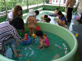 Pre-pre Schoolは、四月より一人、また一人とお友達が増えて、現在10組(子ども達は11名、双子ちゃんがおられます)の親子で活動しています。週三回(火・木・金曜日)10時〜11時半まで、「今日は、何して遊ぼうかな?」「今日は、どんな事をするのかな?」みんな、雨空の日も元気一杯に来てくれています。6月17日からは、幼稚園の中屋上にてプール(水遊び)が始まり、水着姿がまた何とも可愛らしいです。子ども達は、ぴちゃぴちゃと水の感触を楽しみ、またお母様方は、そんな楽しく遊ぶ子ども達の側に寄り添い一緒に遊んでおられます。我が子だけでなく同じクラスのお友達の遊ぶ姿から、成長を感じ取ったり、同じ年齢のお子さんをお持ちになる母として、様々な情報交換の場としてお互いに話を交わされ、とても有意義な時間を過ごしておられるのではないかと思っています。そして、自由遊びの後は(プールでも)お片付けの時間です。しっかりみんなでお片付けをしてから、排泄・手洗いも済ませ、みんなお椅子を先生の前に並べて、お名前を呼んでもらいます(出欠確認)。最初は恥ずかしくて手をあげるのが精一杯だったお友達が、ある日ある時「はい!」と手をあげてお返事出来た瞬間には、自然とみんなから拍手、そして「すごいね〜」「うわぁ〜おりこうさん!」等々、沢山のお褒めの言葉が飛び交います。とても嬉しい瞬間です。そして、「おはよう」のお歌をピアノに合わせて歌い、お祈りもします。その後は毎回お楽しみの先生による絵本の読み聞かせ。その日の活動や、時節に合わせた絵本(紙芝居)を毎回一冊、みんなお椅子にちょこんと座って最後まで釘付けです。お母さんのお膝の上で読んでもらう絵本も大好きだけど、幼稚園ではまた一味違います。集団の中で集中して見聞きする経験がこれから先に繋がっていく事をひしひしと感じます。また、毎回その日の主活動も季節や子ども達の成長・発達、『今だからこそ、この時期に、親子でさせてあげたい事』を設定し、製作・リズム遊び・運動遊び・表現遊び・等々、その日によって異なります。ただ製作といっても「作って出来上がり!よかったね〜」だけの事ではなく、手先の巧緻性を意識したり、色や数の概念を意識したもの、今の季節に合わせ、子ども達が自然に親しめるきっかけになって欲しいと願いが込められたもの等、思いは沢山あります。親子教室ならでは!・・共に感じ・共に取り組める場を得て、また、子ども達への援助の方法を知って頂ける機会となっているところです。よくお母様方から活動中に、「そうなんだ〜」「そうしたらいいんだ〜」「なるほど!」といった嬉しい囁きが聞こえてきます。