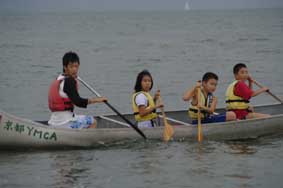 午後からは、八王子保育園の園バスに乗せていただいて、近江八幡国民休暇村のプールに行きました。一時間たっぷり楽しんで、こんがり日焼けした子ども達。さらに嬉しい事は、特別プログラムで夕食は園庭までホットプレートを引いての焼肉でした。その準備を進めてもらっている間に、子ども達は思い出の麦わら帽子作りに励み、一人一人素敵な記念の品を作りあげることが出来ました。お待ちかねの焼肉タイムは、普段以上に食欲旺盛な子ども達に先生達もびっくりしました。日が暮れ行く約二時間、口の周りがソ―スまみれになりながら美味しくて楽しくて、お腹一杯の夕食となりました。更に、八王子保育園に隣接する「むべの里」の大きな浴室も今回お借りすることができ、子ども達はシャワーのみならず大きな浴槽に体を沈めて(子ども達の就寝後は順に先生達もお風呂をいただきました。本当にありがたかったです。)身も心も、休めることができました。やがて、訪れる「おやすみなさい」の時間。あっと言う間に寝息が聞こえ、朝までぐっすりと眠る子ども達の寝顔は、いつもながらかわいらしく、その寝顔を見られる事に幸せを感じる先生達なのでした。また、次の日は特別プログラムも有り、二隻に分かれて小雨の中、葦林の中を「水郷巡り」をし、琵琶湖の水面を楽しく滑ってきました。