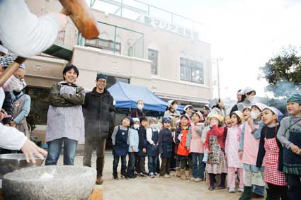 まずはつきたてのおもちをコロコロ丸めます。最初は緊張した面持ちの子ども達、しだいにお餅の柔らかな感触ににっこり笑顔へ。一生懸命丸めました。さぁ、次は力の見せどころ!お庭でお家の方と杵を持ちおもちを搗きます。杵を手にした子ども達、予想をはるかに超えた重さに驚きながらも、さらに力が湧いて「よいしょ!、よいしょ!」と力一杯、元気一杯。