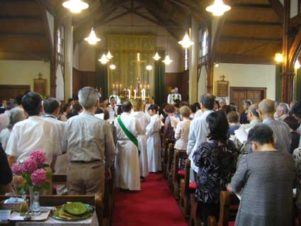 京都伝道区合同礼拝が6月26日(日)10時30分よりアグネス教会で行われました。京都伝道区11箇所の教会から219名が集まり、高地主教様、奥司祭の司式、牧師 越川弘英先生(日本キリスト教団正教師)のお説教で礼拝をお捧げする事が出来ました。3月11日に起きた東日本大震災の被災者・原発事故による被災者、関係者の方々を覚えてお祈りしました。また、今年はマリアが信伝協の当番教会でもあり、聖餐式では十字架捧持者に佐竹登さん、蝋燭捧持者として続木明佳ちゃん、森田しおりちゃん、山口順帆くん、吉村真綾ちゃんが大活躍して下さいました。(ホントに感謝!)