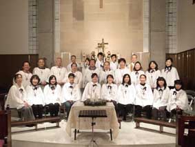今年は降誕日が総員礼拝の日になり、理想的な形でイエス様のご生誕をお祝いできることになりました。当日は約一二〇名の方々と共に礼拝を捧げました。ハンドベルの演奏は素晴らしく、聖歌隊についてはうまく世代交代が出来ているようで、小学校高学年から中学生の信徒子妹達がすばらしい「天使の歌声」を聖堂いっぱいに響かせてくれ、お祝いを盛り上げてくれました。礼拝後はホールで祝会です。恒例となった持ち寄りの食事会も、皆さんの腕によりを掛けた素晴らしい料理が並び、信徒子弟のマリア幼稚園在園生を中心にクリスマスページェントの再現披露も盛り上がりました。サンタさんの登場もあり、楽しい会になりました。