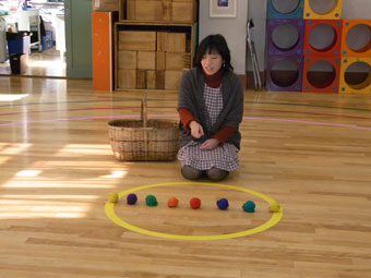 幼稚園の創始者フレーベルおじさんからのプレゼントは、今日もマリアの子ども達の大切な教材として、ゲームの主役を担っています。子ども達にとってもお馴染みになった6色の毛糸球『第一恩物』。 この日は、黄色いタンポポ、緑の葉っぱ、紫のスミレ、赤いチューリップをホールに咲かせて、お花摘みに出かけるゲームです。『♪黄色い色はタンポポ、紫色はスミレ、赤い色はチューリップ、緑の色は葉っぱです。綺麗なお花を摘みましょう。どんなお花を摘みましょう?よ〜く聴いて出かけましょう。記憶装置にスイッチON!』先生が、こんな風に歌い出すと、子ども達は、自分の利き手で頭にあるであろう記憶装置にスイッチを入れて、何色が何のお花かを覚えるのです。そして、冒頭の歌に繋がります。ホールに引かれた丸いお筋の上を先生が歩きながら、更に続けて歌います。『♪細い畦道を転ばぬように、さぁ、ご一緒に出かけましょう。』先生に手招きされた、子ども達は先生の前に並び、また、歌にあわせて歩き出すのです。歌の結びは、『タンポポにタンポポにスミレ』…と摘んでくるお花を伝えます。子ども達はそれを聴いて、ホールの真ん中に並んだ花々を、摘みに行きます。毛糸球の紐を茎に見立てて、そっと手首にかけて、再び先生の元に戻ってきて、摘んできたお花を届けてくれます。