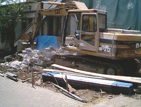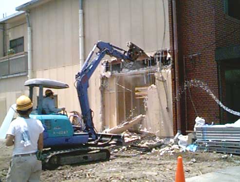 ○5月25日から、渡り廊下、旧礼拝堂玄関の取り壊し、ベストリー、会館入口、二階押入部分の養生の工事が始まり、29日には、丸太町通の塀と門の取り壊しが行われました。礼拝は、幼稚園ホールで行い、礼拝後の昼食は従来通り会館集会室でいたしますので、礼拝後は園庭から一度外に出て、会館にお出でください。