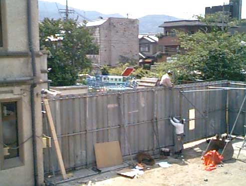 ○5月22日(土)、丸太町通り歩道に重機乗入れのため敷鉄板敷設。幼稚園園庭側仮囲い設置。