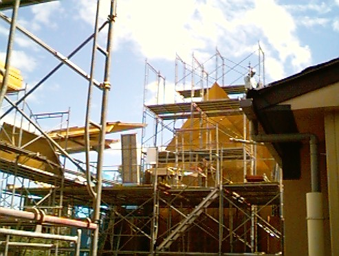 ○幼稚園が夏休みに入って、幼稚園園舎の改修工事が始まりました。一階天井、壁、階段等のケレン、付属物の撤去工事、ボード貼り、一階の天井、壁の塗装。外部足場の組立、外壁の洗い等の工事が進んでいます。