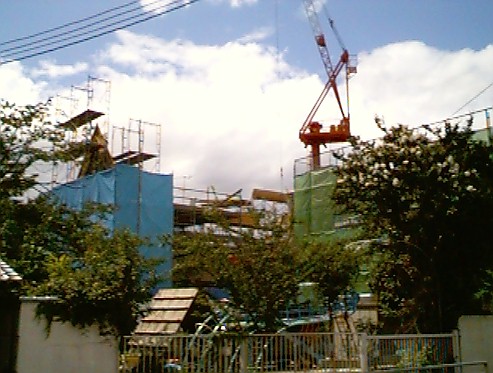 ○7月12日 (月)/埋め戻し作業、13日/埋設配管、14日/作業用タワークレーン設置、15日/一階部分柱および壁の鉄筋組方作業、16日〜17日/一階部分配筋および型枠組立てが行われました。
