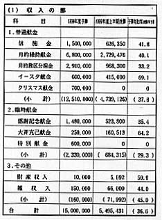 上表に、一月から六月までの収支を掲載させていただきました。収入の部の表については、イースター・クリスマス・大斉克己献金といった時期の献金以外は予算対比を二倍して参考パーセントにしていただければよいかと思います。ご覧のように収入が予算を大きく下回っております。信徒の方には月約献金、教区分担金の滞りのないようにお願いいたします。また、感謝献金を折にふれお献げください。支出については、いまのところ予算対比を見ても抑えられてはいますが、建築工事に伴い、予想外の支出も出てくるかと思います。建築献金その他、大変でしょうがよろしくお願いいたします。