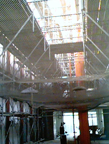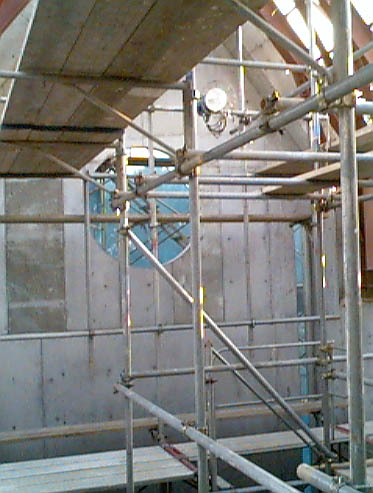 ○9月5日から、内部の足場を取り除き、床にコンクリートを打つために鉄筋の配筋、型枠組上げの工事が行われました。12日から床のコンクリート打ちが行われました。床のコンクリートの養生がすんだ後、内部に再度足場が組み上げられ、西側、東側の外壁のALC板の建て込みが行われました。