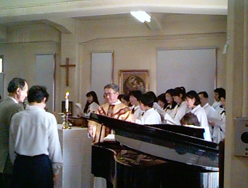 4月12日(日)、イースター。聖マリア教会のイースターは朝4時半から始まります。ジュニアチャーチの中高生、スタッフたち総勢30名はその四時半に教会に集まって一路大文字山に向かいます。まだ薄暗い中、散りかけの桜を楽しみながら登山。大文字山の大の字の上の部分で朝の礼拝を行います。九時からは日曜学校の礼拝。元気な小学生が礼拝を捧げます。本番のイースター礼拝は午前10時45分より。毎年のように聖歌隊も登場しました。今年の聖歌隊はクワイヤーミストレス吉村由理姉率いるフレッシュメンバーが多く、平均年齢もぐっと若くなりました(ただし女声のみ)。礼拝出席者は160名。幼稚園ホール満席状態で礼拝を捧げることができました。感謝!