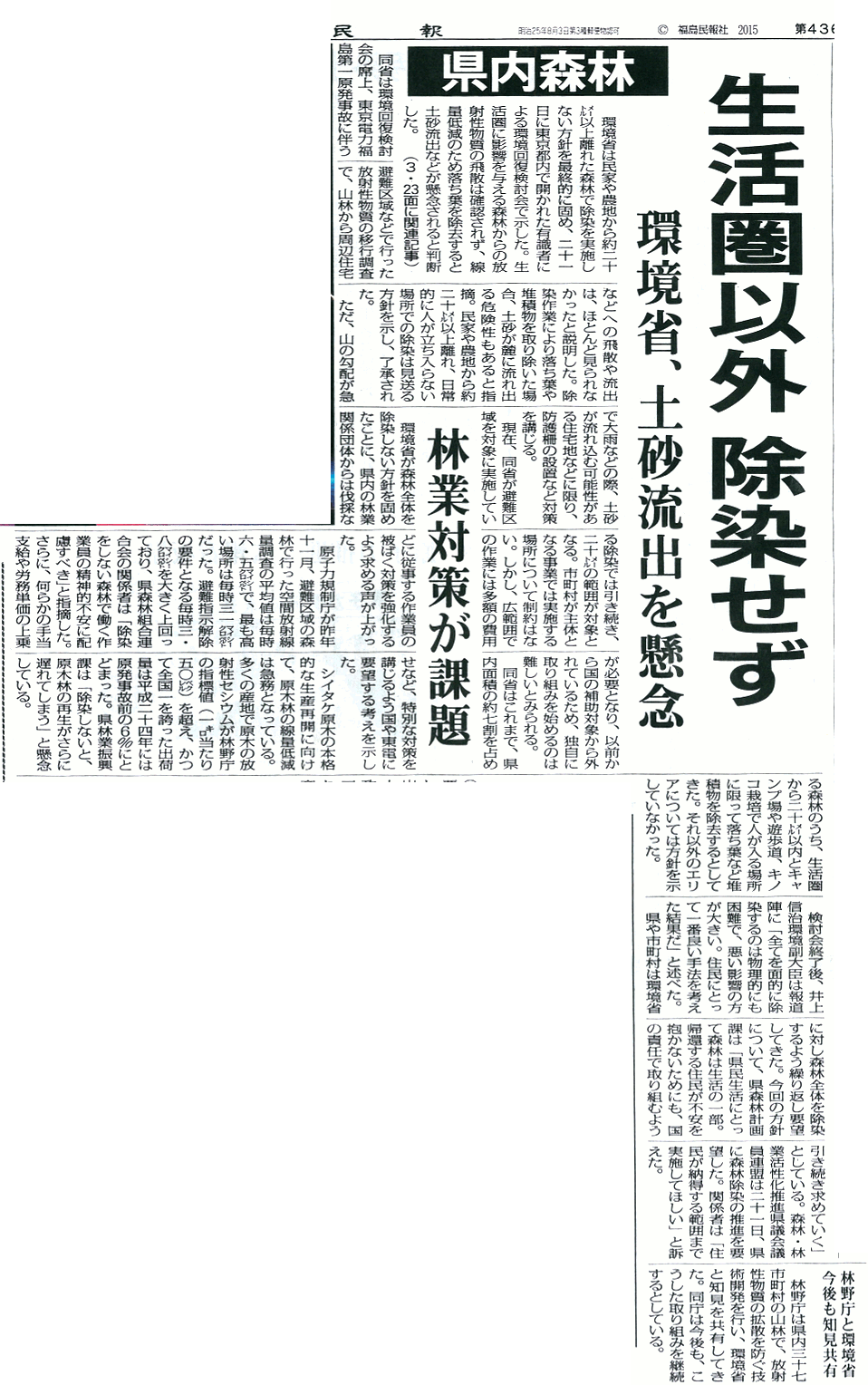 On December 21st, 2015, Japan’s Ministry of the Environment determined that it would not decontaminate the forest of Fukushima some 20m (22 yards) or more apart from the nearest residence or farm. By making this decision, the Ministry rejected repeated petitions from the Fukushima Prefectural Government and municipalities for a total decontamination of the Prefecture’s forest, ignoring their claim that the forest is an essential part of the livelihood of Fukushima’s people. Mr. Norio Akasaka, director of Fukushima Museum, published a document on this issue, questioning the national government’s attitude from the viewpoint of his field of expertise, ethnology.