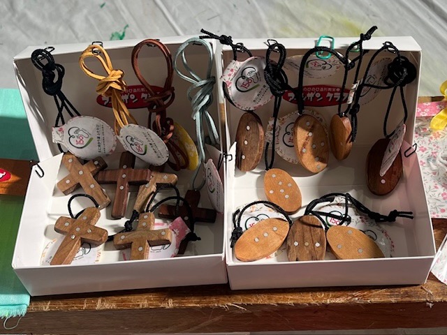 中部教区150周年記念グッズを作りました。ペンダントとキーフォルダーは十字架と雫形、象嵌(ぞうがん)細工です