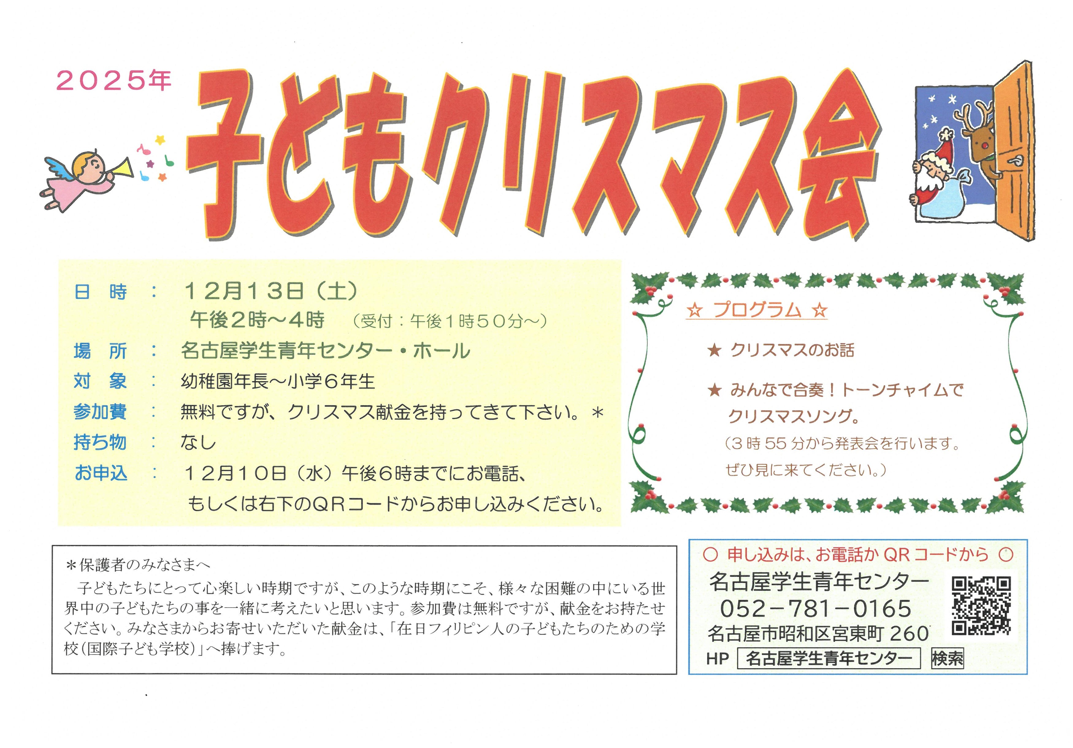- 参加費:無料ですが、クリスマス献金を持ってきてください。