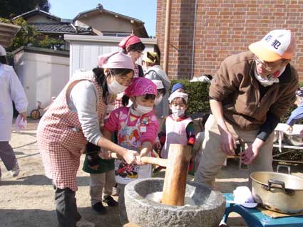さて、1月22日(土)に行われた恒例の『お餅つき』で、三学期最初の行事が始まりました。お天気にも恵まれ絶好の『おもちつき』日和!ですが、残念な事に、風邪・インフルエンザ・マイコプラズマ…等々、三者三様それぞれに体調を崩した子ども達・保護者の方々・教職員と欠席が多く、予定よりはさみしい人数となりました。しかし!お休みしているお友達の分まで頑張って、搗いて!搗いて!搗いて!みんなで四五キロ三二臼のお餅を搗きあげたのでした。臼に杵でのお餅搗きなんて、搗くのはもちろんの事、目にするのも初めてという年少組さんもあり、大興奮の子ども達、「よいしょ!よいしょ!」と歓声を上げながらの楽しいひと時です。いつも遊んでいる園庭のすぐ側で、割り木でのせいろ蒸しには、子ども達はもちろん保護者の方々も経験のない方も多くありました。子ども達にとって、そんな掛け替えのない体験の陰には、ご協力下さった多数の保護者の方々のお力があってこそ、みんなで一丸となって楽しみ・励げみ、何だか言葉には言い表せない一体感を感じました。お餅を小さな手で必死にコロコロ丸める子ども達の嬉しそうな、そして真剣な面持ち。もう楽しくて楽しくて笑ってしまいます。そんな間も、子ども達をはじめみんなでいただくお餅をどんどんご用意下さる保護者の方々も大忙し!そして、待ちに待った時間がやって来ました!「今日のお昼ご飯は??」もちろん!マリア特製のお餅のフルコースです!餡子餅・きな粉餅・磯辺餅、もう一つは「焼き芋焼き芋 あちちのち!」と歌の通りのほくほくお芋。更に、前日から特別にご用意下さった嬉しすぎる京都の味!「おすましのお雑煮」に「白味噌のお雑煮」です。何と贅沢な…。しっかりと神様に感謝して、そしてご用意下さった保護者の方々に感謝して、いよいよ「いただきます!」もうみんな黙々と食べて・食べて・・食べて!「おいしい〜!」と、にっこりほっこり良いお顔です。お口一杯に頬張ったお餅の味・感触、きっと忘れられない大切な思い出に加わりました。「日本」ならではの体験、準備から大変な労力が掛かりましたが、子ども達にとって残していってあげたい貴重な行事。お手伝い下さった保護者の方々に心から感謝したいと思います。また、弟妹の可愛いお友達も元気な小学生も、そして!久保田のじいちゃんも、浦地先生、見学にいらした西大和双葉幼稚園の先生方も、本当にありがとうございました。改めて、マリアの行事って、みんなが一緒で本当に幸せです。