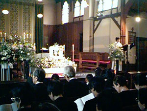 4月30日(木)午後7時30分より、幼稚園ホールで通夜の祈りが捧げられました。これは、ご本人の遺志により、その生涯を捧げた聖マリア幼稚園の床の上で、一般の通夜のように壁を白い布で覆ったりせずに、本当に幼稚園の雰囲気そのままの会場で行われました。参列者400余名。幼稚園ホールに入りきれない人々が園庭を埋め尽くしました。通りがかった近所の方があわてて着替えて通夜の祈りに出席される姿もたくさん見受けられ、本当に地域に密着した教育をなされていた良子先生のお人柄が伺えました。幼稚園の先生方、母の会、教会信徒の方々の協力により、大至急に用意した、通夜の祈り・葬送の祈り共通の式文600冊も、その大半がこの通夜の祈りに使われ、急遽予定を変更して、翌日の葬送の祈りのために回収することになったほどでした。