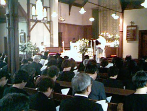 翌5月1日(金)午後一時より日本聖公会聖アグネス教会礼拝堂において、葬送の祈りがとりおこなわれました。この礼拝堂も良子先生が青春を過ごした平安女学院の思い出深きところです。この式も、京都教区一番のキャパの礼拝堂満席の会衆を集め、一堂で良子先生にお別れを告げました。献花を捧げ、出棺の時には聖歌430番が湧き上がり、すすり泣きとともに、旅立たれました。