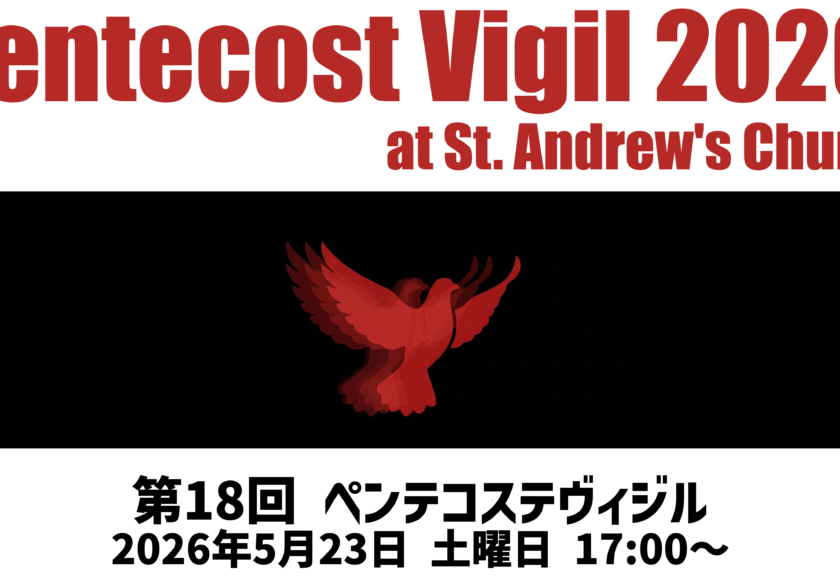 2026年5月23日(土)17時から、昭和町にある大阪聖アンデレ教会でペンテコステビジルが行われます。エキュメニカルな諸教会の交わりと一致の具体化をめざし、カトリック教会、日本聖公会、日本基督教団、日本福音ルーテル教会の有志が中心に行っている礼拝で、教派に関係なくどなたでも参加できます。詳細は以下の案内をご覧ください。