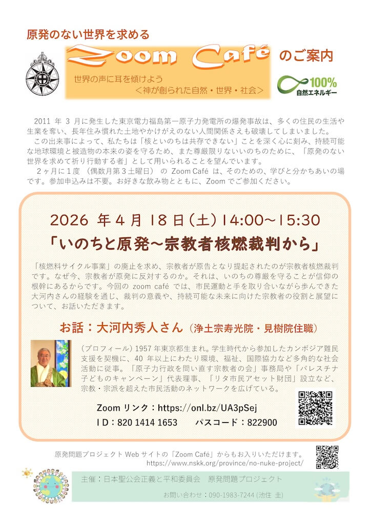 Zoom Café を開催します。「いのちと原発〜宗教者核燃裁判から」大河内秀人(浄土宗寿光院・見樹院住職)