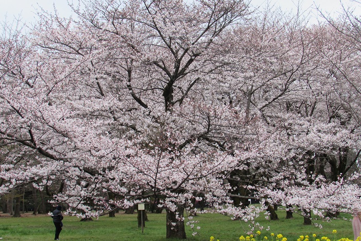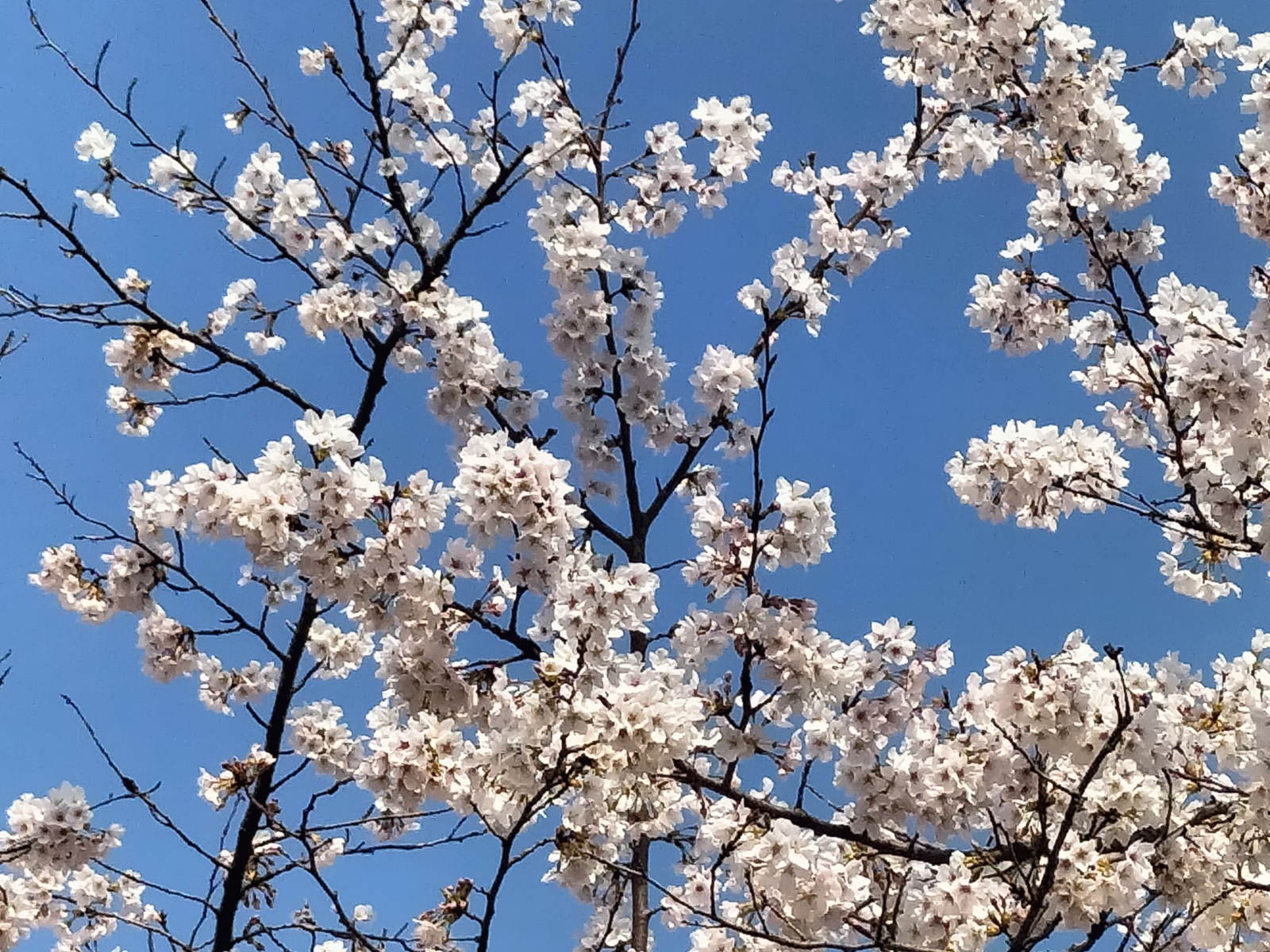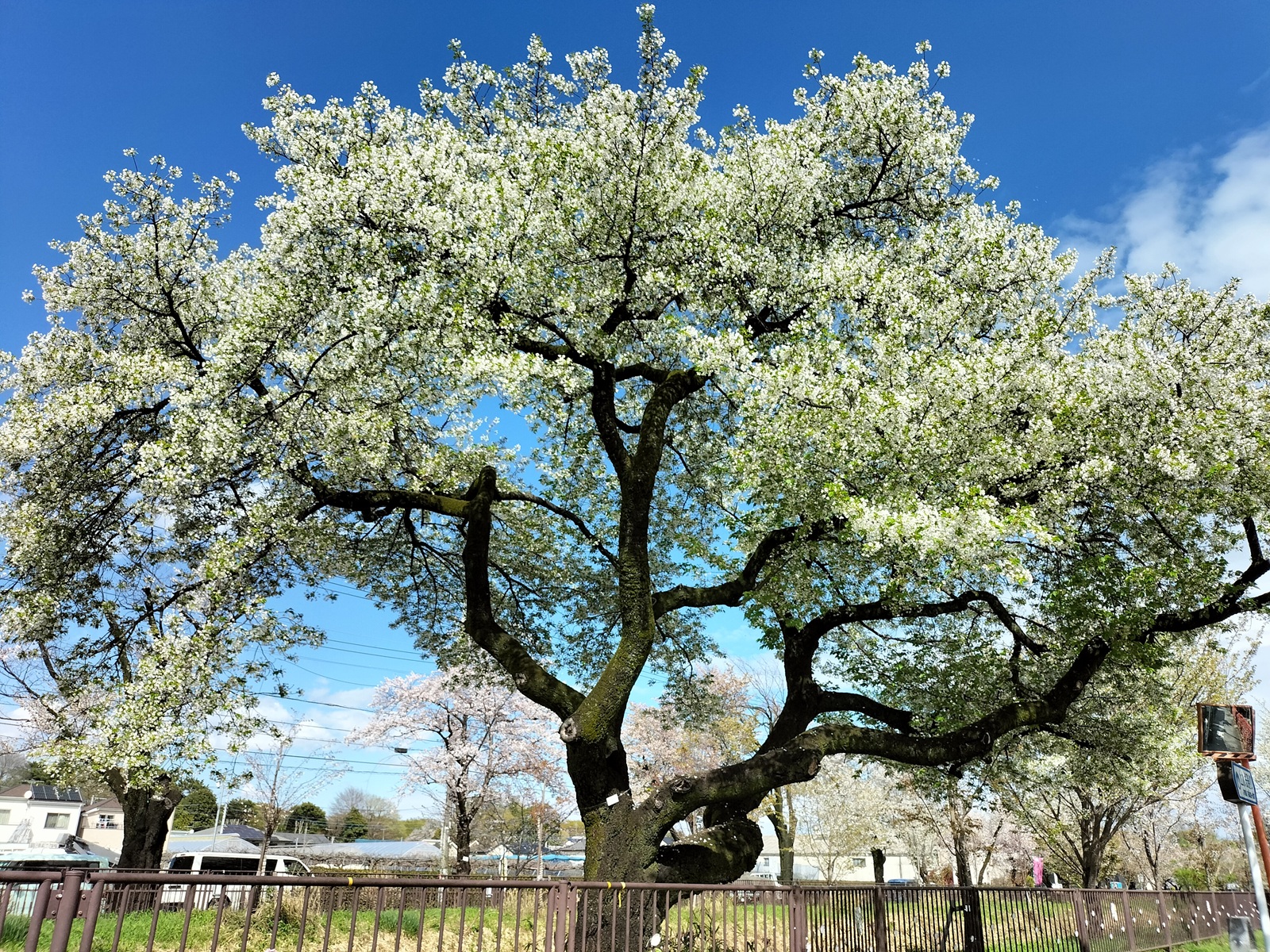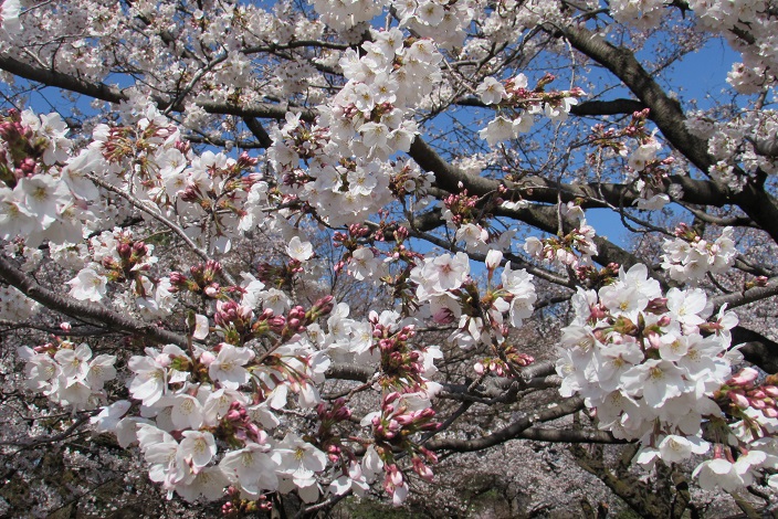 玉川上水の土手の上の大島桜。花と一緒に新緑の若葉も芽生えています。(4月3日撮影)