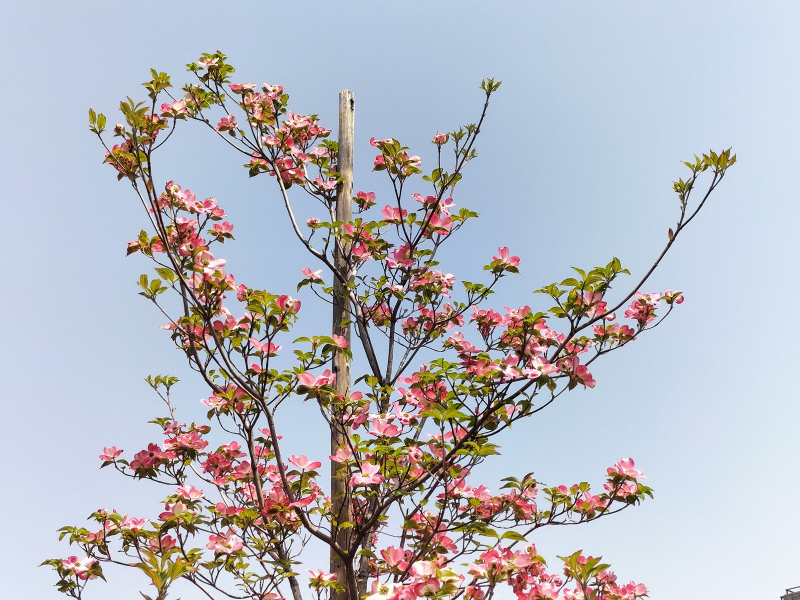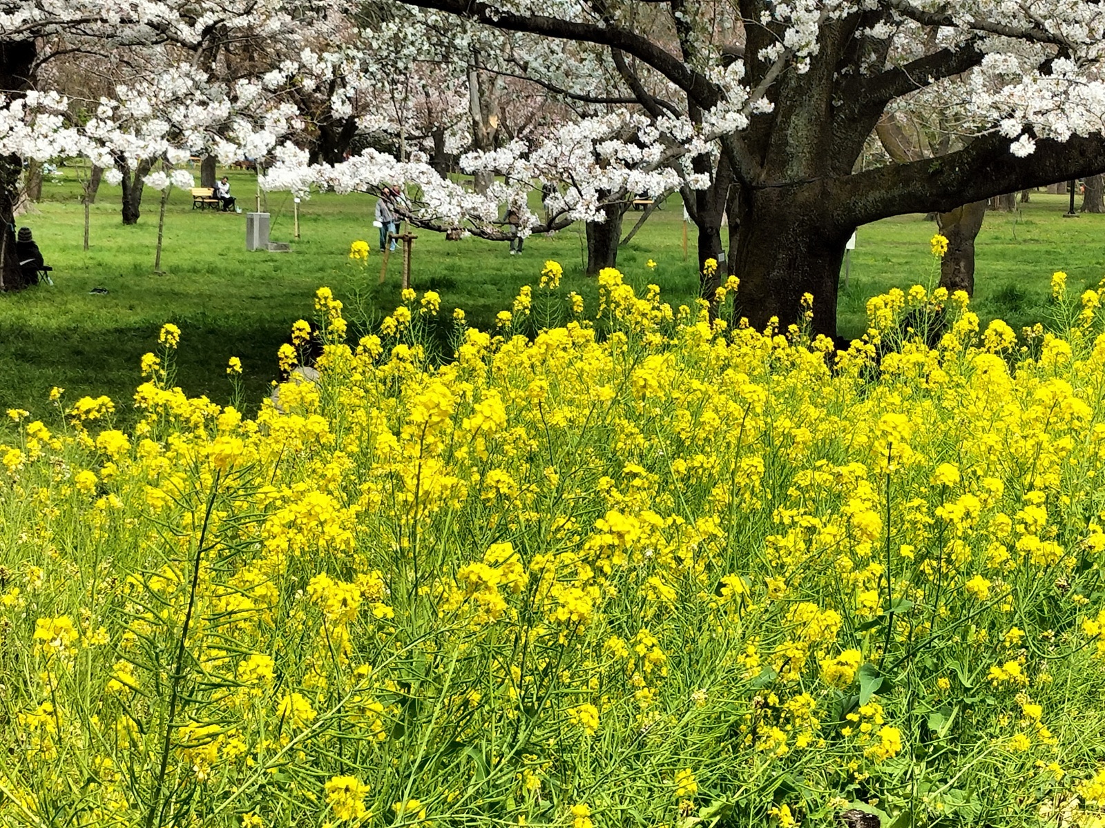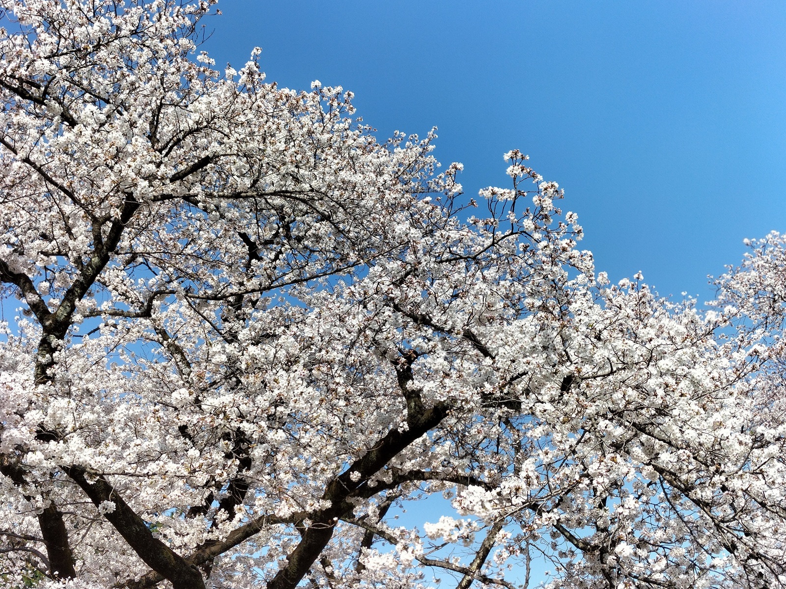玉川上水の土手の上の大島桜。花と一緒に新緑の若葉も芽生えています。(4月3日撮影)