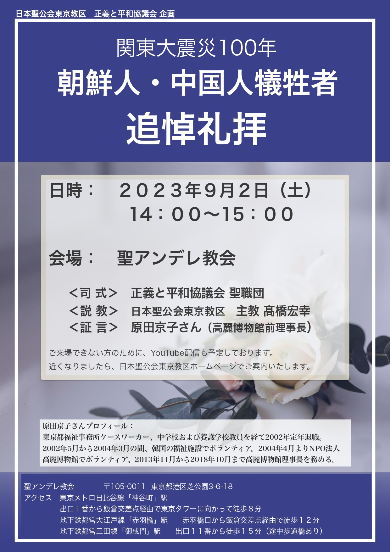 2023.9.2 正義と平和協議会 関東大震災100年 朝鮮人・中国人犠牲者追悼礼拝(youtube 配信)