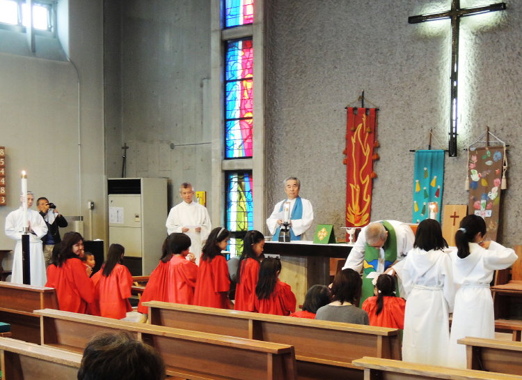この記念の日、喜びに包まれて洗礼式と、イエスさまの愛された子どもたちのための児童祝福式が行われました。愛のみ業をもって、受洗者と子どもたちの成長を見守ってください。